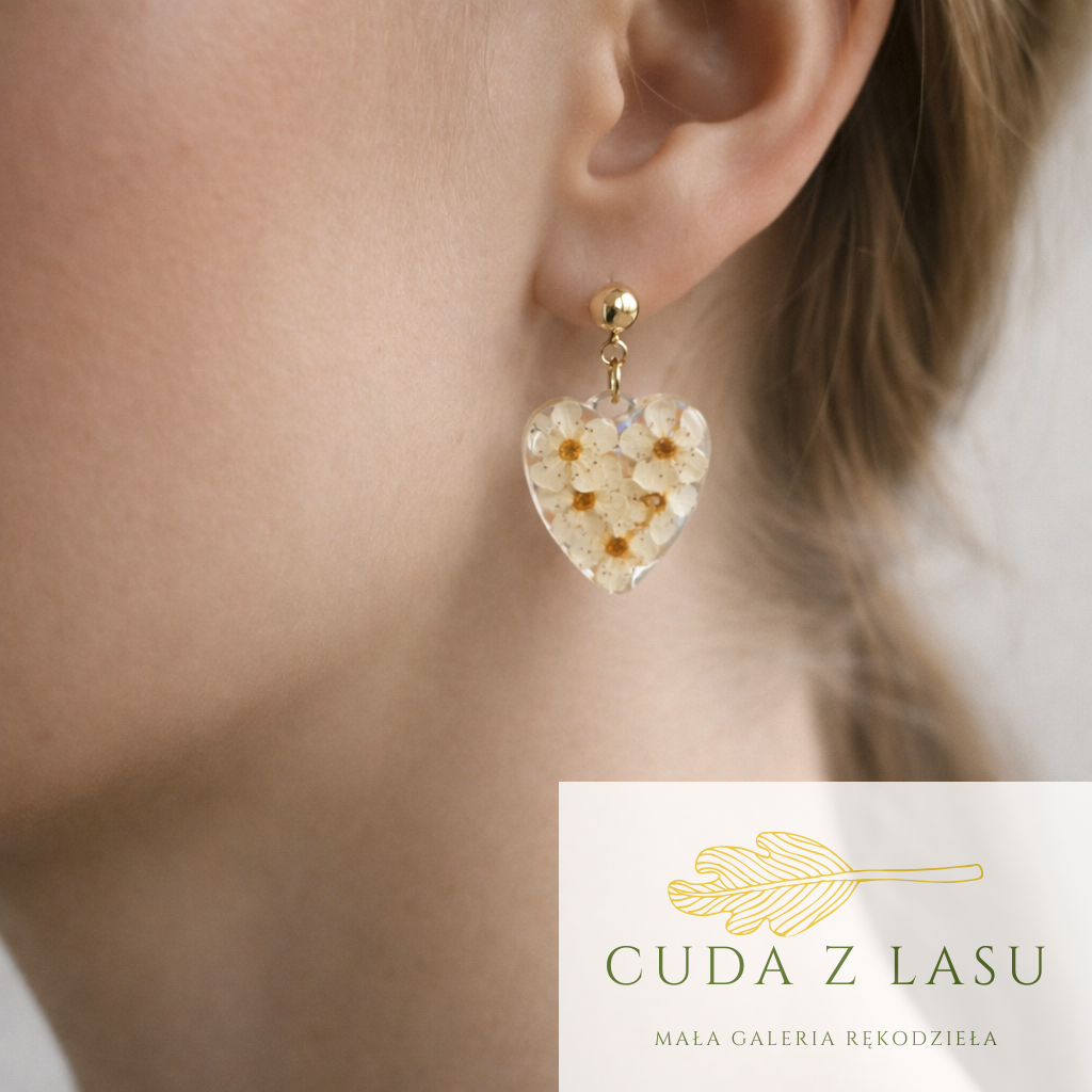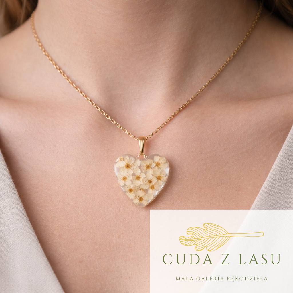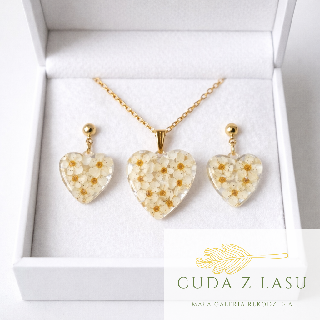 Wyjątkowy zestaw biżuterii z zatopionymi kwiatkami tawuły w sercu.